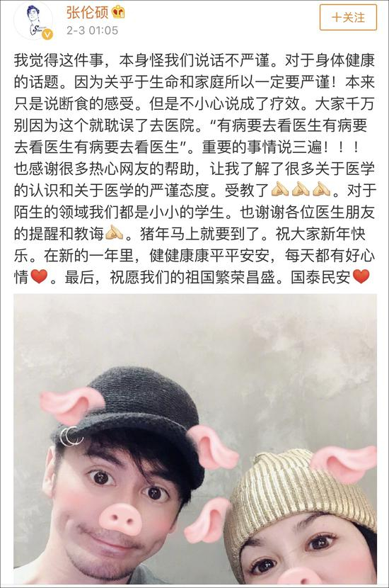 3日凌晨,钟丽缇老公@张伦硕 回应网友的质疑,称这件事本身是“说话不严谨”所致,本来只是说断食的感受,但是不小心说成了疗效,同时提醒大家生病了应该去看医生,不要耽误。