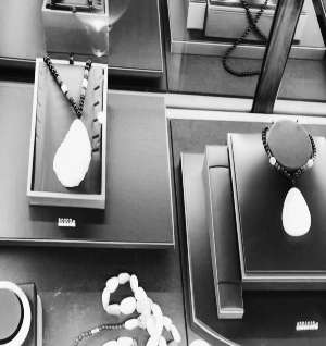在中国蓝田总部大厅的休息区内,有一组摆放着玉石的展柜,并且每块都有标价,都在数万元以上。这是收藏摆件还是销售商品呢?