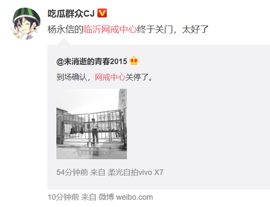 2月20日15时32分,微博认证为“2015年网戒中心揭发人”的用户“@未消逝的青春2015”发布微博称“到场确认,网戒中心关停了”并配一张“青少年性格缺陷矫治中心”图片。此外,该微博用户在评论区称:“杨医生目前在门诊楼不定期坐诊,有兴趣的可以来挂个专家号咨询一下”。随后,有网友指出,配图中的地点正是杨永信网戒中心。