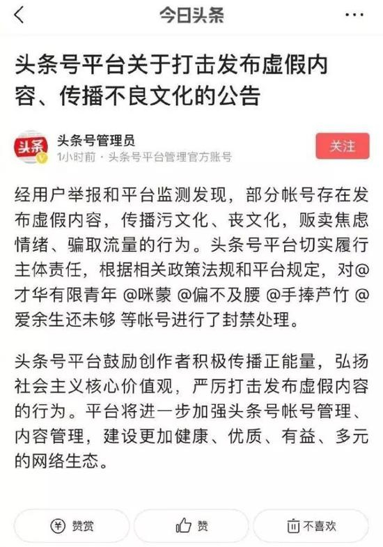 目前,今日头条和凤凰网都已发出声明关停平台内咪蒙账号,咪蒙在其他平台的账号也在陆续被封禁。