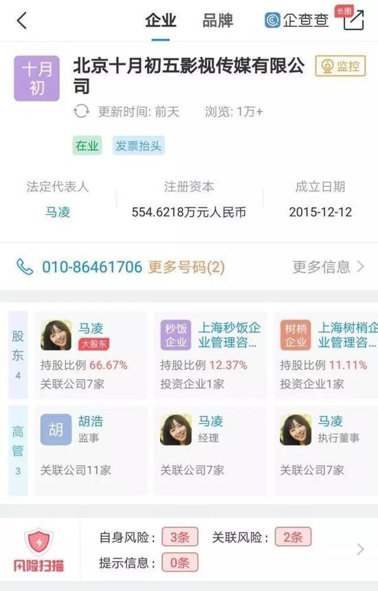 2015年12月,北京十月初五影视传媒有限公司注册,马凌为北京十月初五影视传媒有限公司的法定代表人,同时为该公司大股东,持股比例66.67%。