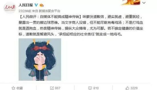 人民日报官方微博表示,咪蒙发道歉信,避实就虚,避重就轻,暴露出一贯的擦边球思维。当文字商人没错,但不能尽熬有毒鸡汤;不是打鸡血就是洒狗血,热衷精神传销,操纵大众情绪,尤为可鄙。若不锚定健康的价值坐标,道歉就是暂避风头,“承担起相应的社会责任”就变成一地鸡毛。