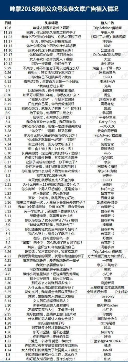 下附:咪蒙2016微信公众号头条文章广告植入情况