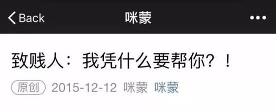 事实上,当咪蒙写出《我是如何成功地把一家公司开垮的》时,她已经不再需要为创业失败而忧心了。在这篇文章出炉之前,大名鼎鼎的“始祖级”爆款网文《致贱人:我凭什么要帮你?》已经一炮而红,让咪蒙火遍了整个中国互联网。然而,也正是这篇为咪蒙打开了事业新春的《致贱人》,让咪蒙从一开始就沾染上了媚俗、恶化网络风气的争议,最终将她引向了人仰马翻的结局。