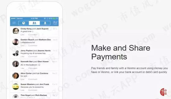 Venmo,是公司2013年收购的一款个人对个人(Person to Person, P2P)的移动支付产品,其最大特色在于主打“支付+社交”。