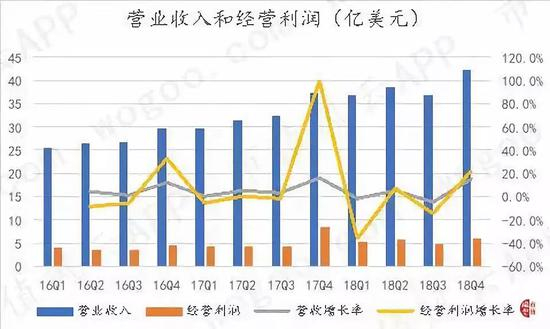 2016年-2018年,公司每季度的营收总体上呈现上升趋势,平均每季度营收的复合增长率为4.7%。2018年第四季度,公司营收创历史新高,达42.3亿美元。