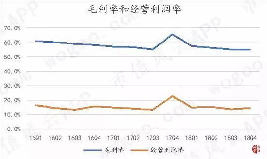 2016年-2018年,公司毛利率总体上呈现下降趋势。2018年第四季度,毛利率已从2016年第一季度的60.4%下降到当前的54.6%。