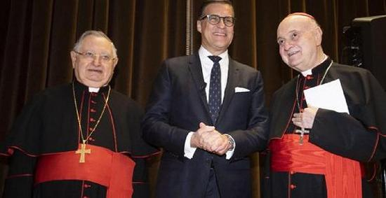 前来迎他入宴的,是一身红衣的枢机主教Giuseppe Bertello和Angelo Comastri。