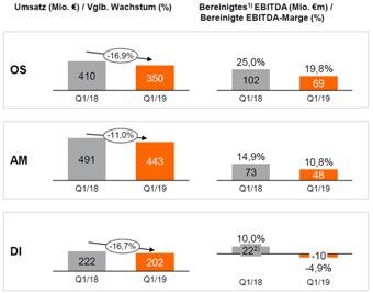 2019财年第一季度三大业务都出现了下滑,左为营收,右为息税后利润。OS、AM、DI分别代表欧司朗的三大业务部:光学半导体、汽车和数字。 图源:欧司朗