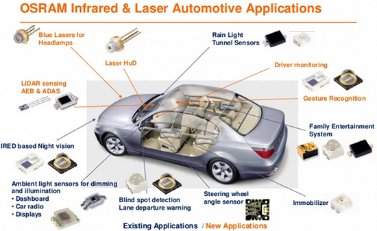 随着欧司朗发力汽车市场,如今欧司朗的光学传感器已经遍布整车。 图源:欧司朗
