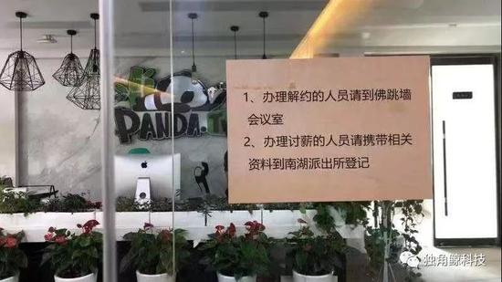 3月8日下午,熊猫直播位于望京SOHO的办公区贴出了告示:办理解约的人员到佛跳墙会议室,办理薪酬结算的人员携带相关资料到南湖派出所登记。去过南湖派出所的刘先生称,派出所民警向他们展示了与熊猫互娱总经理龙飞的微信对话,办理了登记后,劝他们等待破产清算后再来。
