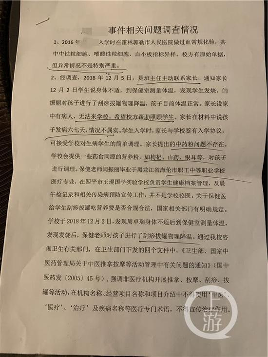 《调查情况》称,家长认为穿刺对孩子伤害太大,希望通过中医治疗,并询问王某的联系方式并联系诊治,学校未参与此事。