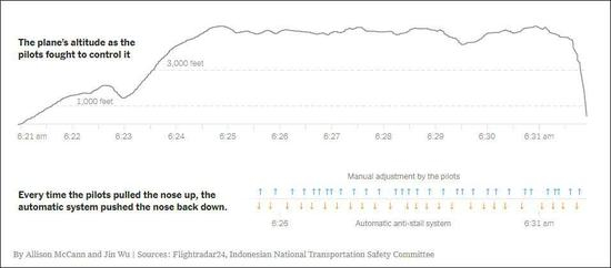 随后9分钟内,狮航JT610航班驾驶舱内出现“人机大战”。机上电子系统警告驾驶员“飞机失速”,机头开始下坠。机长试图让飞机爬升,但电子系统仍显示“失速”,机头继续下坠。