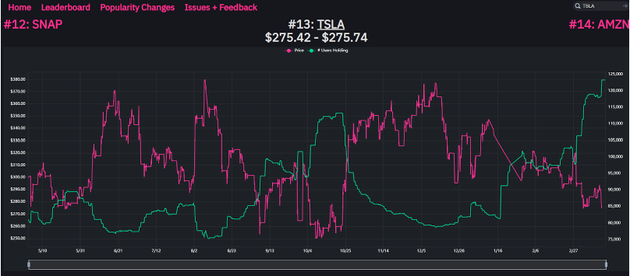 当公司股票下滑之际,散户投资者一直在积极购入特斯拉的股票。股票交易代理商Robinhood所持有特斯拉股票的账户增加了超过50%。