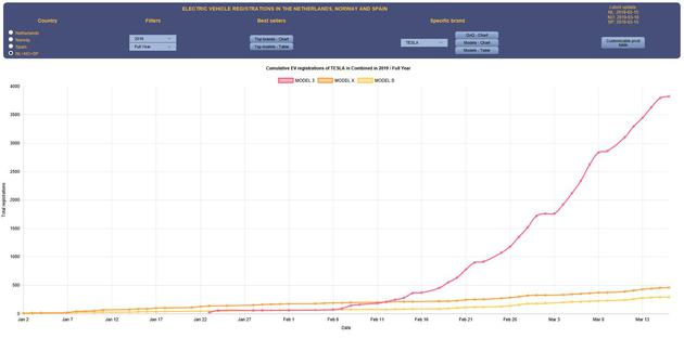 截至3月16日,特斯拉在挪威、荷兰和西班牙(拥有每日注册数据的欧洲市场)共售出3821辆Model 3,457辆Model X和291辆Model S。需要指出的是,去年荷兰是特斯拉在欧洲的最大市场,挪威是特斯拉在欧洲的第二大市场。