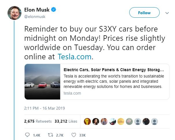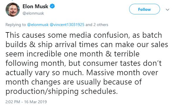 2月19日,马斯克发表推文表示特斯拉将在2019年生产大约50万辆汽车。但是按照2018年第四季度公司公布的报告来看,交付量应该在36万至40万辆之间。或许是在与特斯拉的“推文保姆”进行沟通之后,马斯克更新了自己的推文,澄清了自己的说辞。
