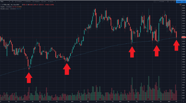 特斯拉股票目前处于200周移动平均线。过去三年来,每当特斯拉的股票到达这一水平时,它都能找到支撑点,并且迅速反弹。这就像是有些实体意识到这个技术性支撑点非常重要。一直以来,每当特斯拉股票到达关键性的技术点时,埃隆的Twitter账户就会开始积极探讨特斯拉的各种“推进事宜”。过去一个月来,埃隆的推文或产品发布均无法让公司股价上涨。基于公司这些“新闻消息”带来的市场情绪变化大幅提高了股价打破先前技术支撑点的可能。我们认为打破先前技术支撑点可能会引发散户投资者抛售股票。