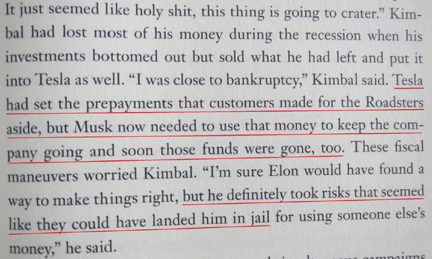 与银行不同,特斯拉不需要区分出客户支付的定金。事实上,支付定金的客户就相当于是特斯拉的无担保债权人。在阿什利·万斯( Ashlee Vance)所著的那本马斯克传记中,他曾透露过一个场景——在2008年末,金巴尔·马斯克( Kimbal Musk )担心埃隆挪用客户定金来维持公司运营会带来法律后果。