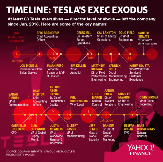 最近几个月来,特斯拉高管人员变动率呈指数级上升。在前总法律顾问戴恩·布特斯温卡斯(Dane Butswinkas)和前首席财务官迪帕克·阿胡贾(Deepak Ahuja)高调离职之后,人员变动情况主要集中在法务部门以及财务部门。根据路透社的报道,从2016年以来,共有40位特斯拉高管已经离职。