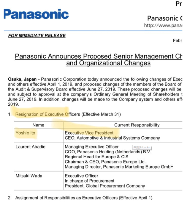 松下负责超级工厂的高管已经于2月底被解雇。根据马斯克的说辞,特斯拉在2018年第三季度初曾“距离破产仅有数周时间”。松下同意重新修改关于超级工厂的合同,将2018年到期的支付承诺延长至2019年。