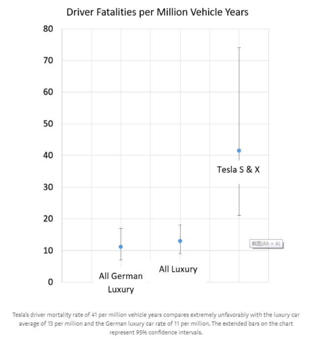 虽然马斯克很喜欢炫耀特斯拉车辆的碰撞测试评级,然而相比其他的豪华汽车制造商,特斯拉车辆的死亡率却高得惊人。如下便是针对特斯拉以及其他汽车原始设备制造商车辆安全情况的分析: