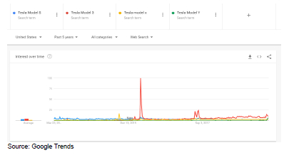 不妨细细思考一下,在Model Y发布之后,媒体对此均未产生任何热议。而在周四晚上发布会之后,马斯克本人几乎一直保持沉默。显而易见,Model Y彻底失败了。根据谷歌提供的数据,与2016年三月推出的Model 3相比,人们对于Model Y的搜索兴趣要少得多。