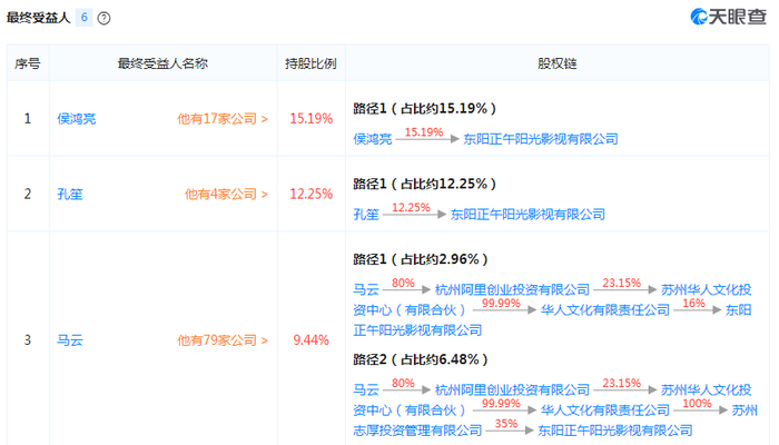 2016年4月,华人文化有限公司增持正午阳光,持股比例达到16%,而侯鸿亮的持股比例再度下降至15.19%,孔笙持股比例下降为12.25%。也正是这两次投资,为正午阳光带来了背后明星股东马云和马化腾。