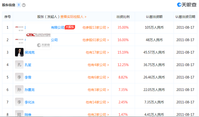 天眼查显示,目前正午阳光股东共9家,大股东是持股比例35%的苏州志厚投资管理有限公司,第二大股东是持股比例16%的华人文化有限责任公司,随后依次是侯鸿亮、孔笙、李雪、孙墨龙等7人,持股比例在15.19%-1.47%之间。