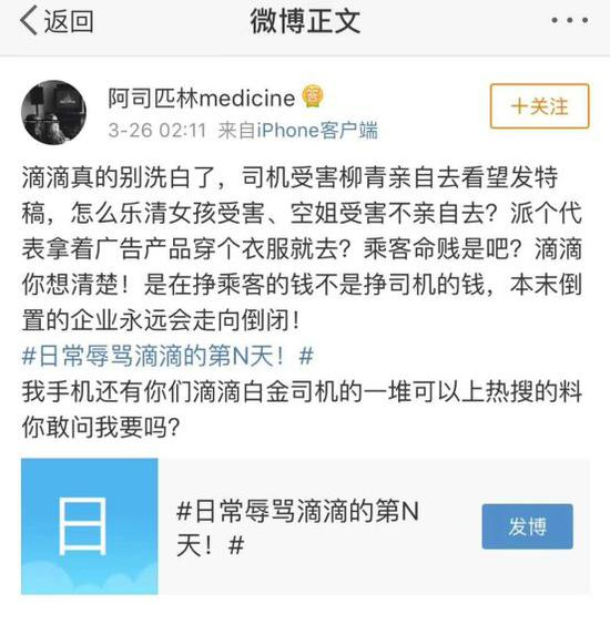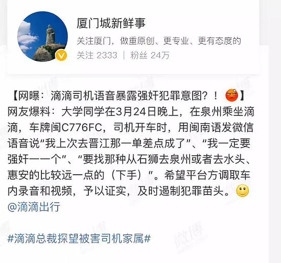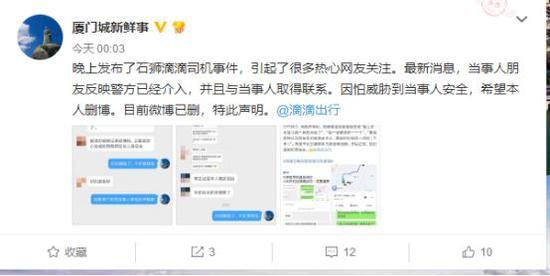 25日凌晨许,@厦门城新鲜事删除了该微博,其说:晚上发布了石狮滴滴司机事件,引起了很多热心网友关注。最新消息,当事人朋友反映警方已经介入,并且与当事人取得联系。因怕威胁到当事人安全,希望本人删博。目前微博已删,特此声明。