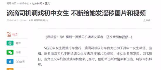这并非孤例。3月2日媒体报道,今年1月中旬的一个晚上,柳州女孩阿欢和4名女生相约,叫了一辆滴滴快车。滴滴司机韦某借口加了阿欢的微信并开始聊天,还偶尔发微信红包给她。后来,该滴滴司机竟给阿欢发淫秽图片和视频,还说些赤裸的挑逗话语。2月28日下午3时许,韦某被民警抓获。