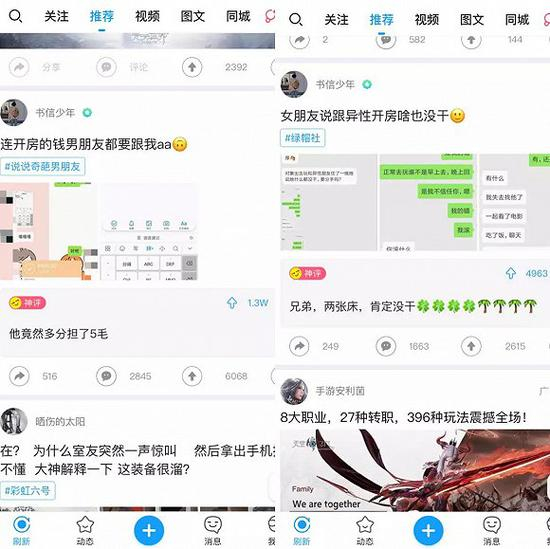 例如“连开房钱男朋友都要跟我AA”、“女朋友说跟异性开房啥也没干”等,底下评论多达几千条。