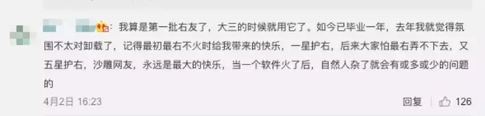对于此次最右APP全网下架,网友的评论褒贬不一。知乎一位早期用户表示,最右最开始的画风确实是以搞笑幽默为主,是一个能够让人“释放压力”的社区,还有一些暖心的正能量视频。近两年的最右,社区氛围变得“低龄化”,“性别歧视、仇富的人越来越多,还有一些最右的特殊现象”。