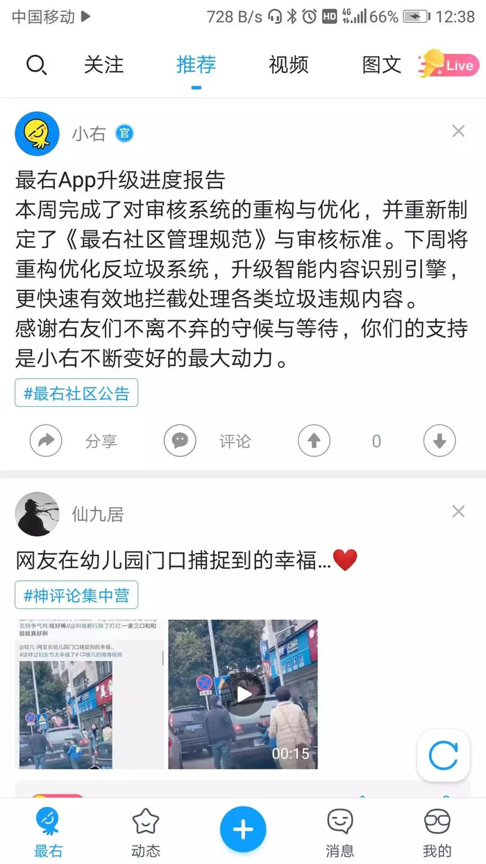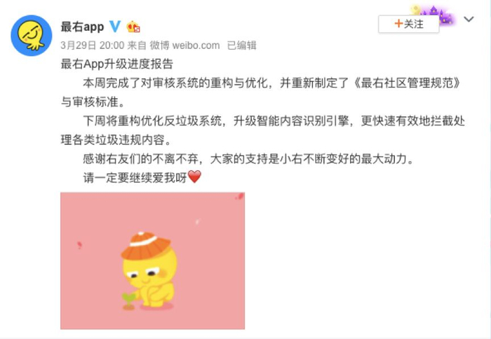 3月29日,其官方微博再次发布消息称,本周完成了对审核系统的重构与优化,并重新制定了《最右社区管理规范》与审核标准。下周将重构优化反垃圾系统,升级智能内容识别引擎,更快速有效地拦截处理各类垃圾违规内容。