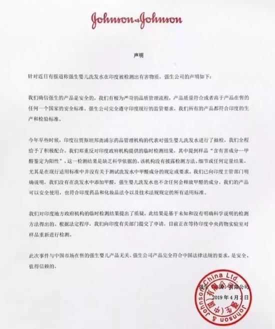 4月2日晚间强生(中国)有限公司发布声明指出,其已对印度地方政府机构的临时检测结果提出了质疑,并已对印度有关部门提出了申请,目前正在等待中央药物实验室对样品进行重新检测。