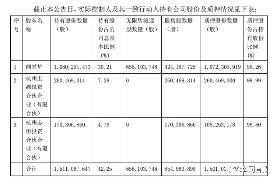 截至公告披露日,闻掌华及其一致行动人合计持股15.11亿股,合计占公司总股本42.25%;合计质押股数为15.01亿股,合计质押股份占公司总股本的41.97%。换而言之,闻掌华及其一致行动人,已将其所持美都能源的99%的股份,已经质押。