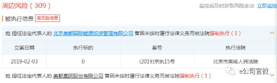 天眼查显示,由闻掌华担任法人的北京美都国际能源投资管理有限公司、 美都集团股份有限公司两家公司,因未按时履行法律义务,于2019年3月2日被立案,北京市高级人民法院系此次案件的执行法院。
