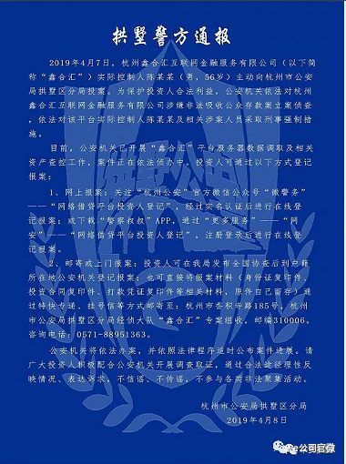 4月8日,杭州公安局拱墅分局对外通报,P2P平台“鑫合汇”实控人投案自首,警方已对平台以涉嫌非吸立案侦查,并对实控人及相关涉案人员采取刑事强制措施。