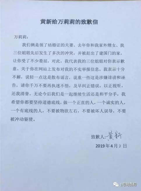值得一提的是,网上同时还流传着一封万莉莉致黄新的道歉信,但对这封所谓的“致歉信”,万莉莉指出,该致歉信为黄新单方面伪造,并不是出自她的手。