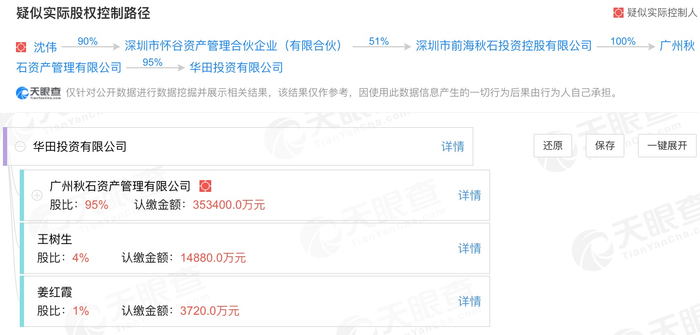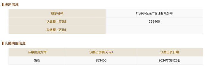 资料显示,广州秋石是一家经营资产管理、投资管理服务的企业,为深圳市前海秋石投资控股有限公司(以下简称“深圳前海秋石”)全资子公司。广州秋石此番出资35.34亿元,成为持股华田投资95%股权的大股东,认缴出资日期为2024年3月26日。