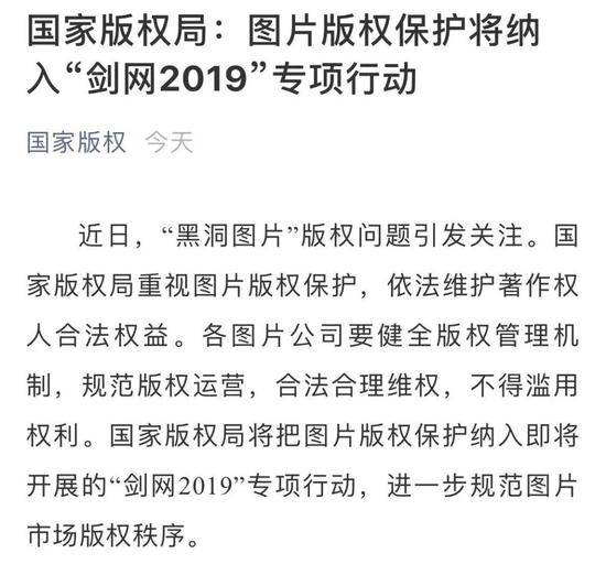 4月12日,微信公号“国家版权”发布称:“黑洞图片”版权问题引发关注。国家版权局重视图片版权保护,依法维护著作权人合法权益。各图片公司要健全版权管理机制,规范版权运营,合法合理维权,不得滥用权利。国家版权局将把图片版权保护纳入即将开展的“剑网2019”专项行动,进一步规范图片市场版权秩序。