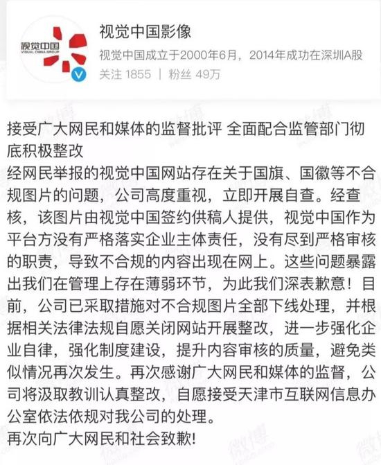 对此,视觉中国在微博上回应称:“经网友举报的视觉中国网站关于国旗、国徽等不合规图片,经查该图片由视觉中国签约供稿人提供,视觉中国作为平台方负有审核不严的责任,为此深表歉意!我们已对不合规图片做了下线处理,并将根据相关法律法规持续性的加强审核,避免类似情况发生。”