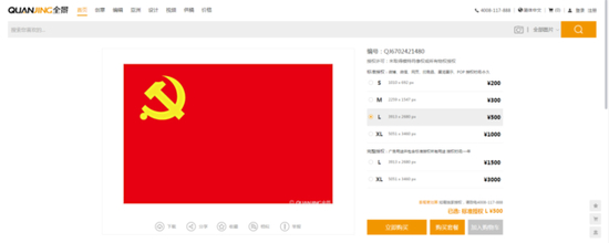 记者发现,“全景”网站上面国旗、党旗、伟人肖像等图片信息当中的授权许可,明确写着“未取得模特肖像权或所有物权授权”或“未知’,但仍可在线支付,“标准授权”价格从200-1000元不等,“完整授权”有1500元、3000元两种价格。