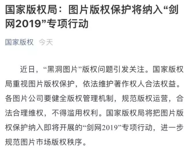 那张引发舆论风暴的“黑洞照片”,其版权所有人欧洲南方天文台在其官网上就表示该照片只要注明来源即可引用,无论新闻还是商业用途。但视觉中国却自称其从通过法新社拿到的编辑类使用授权,并不是每张照片都需要直接联系到作者,“我不可能每张照片都自己去搜集啊,这是我们的正常运营情况”。