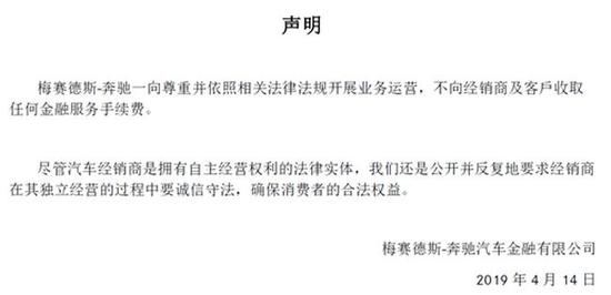 梅赛德斯-奔驰随后发表声明称,公司一向尊重并依照相关法律法规开展业务运营,不向经销商及客户收取任何金融服务手续费。梅赛德斯-奔驰公开并反复要求经销商要诚信守法,确保消费者的合法权益。