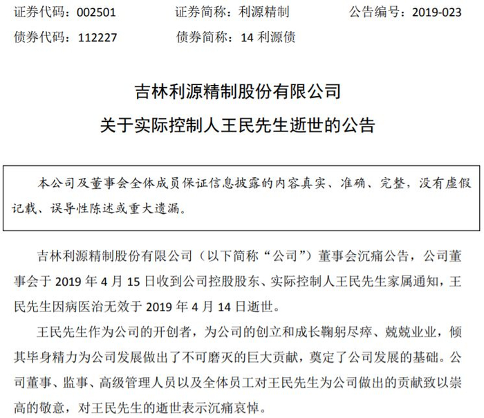 4月15日晚间,利源精制(002501.SZ)公告称,实控人王民于4月14日病逝。