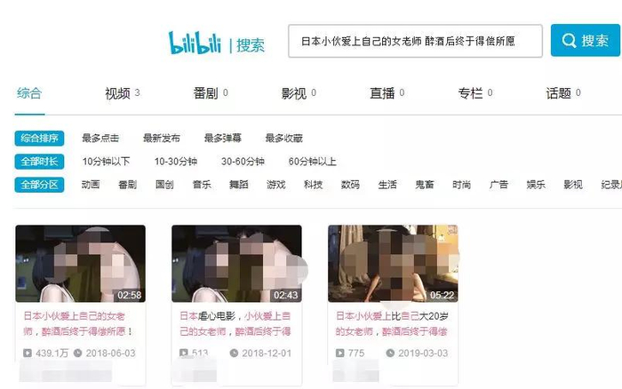 影视杂谈栏目下,一则《日本小伙爱上自己的女老师 醉酒后终于得偿所愿》的视频已有435.3万的点击量,1274人同步弹幕讨论该剧。而在相关剧集里,涉及到乱伦、国外限制级等内容也都有几十万甚至上百万的播放量。