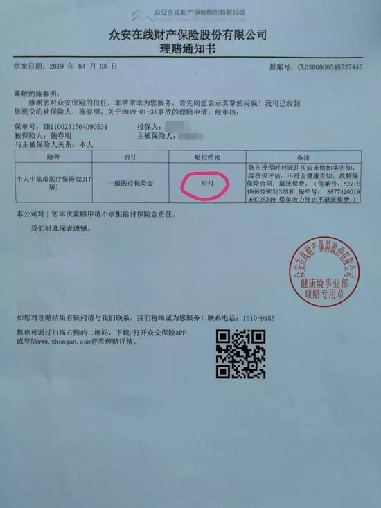 然而记者在刚刚拿到的拒赔通知书上看到,众安要退还的保费仅限2019年,也就是说,施先生2018年的投保至今还是被众安保险认可的。