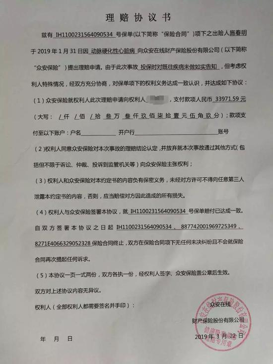 期间,众安保险对施先生的一系列质疑未作答复,仅给出一份空白理赔协议要施先生签署,答应支付本次医疗费用,但前提是必须就此终止合同,也不得再通过其它途径主张权利,还被要求保密,不得向第三方泄露协议内容。