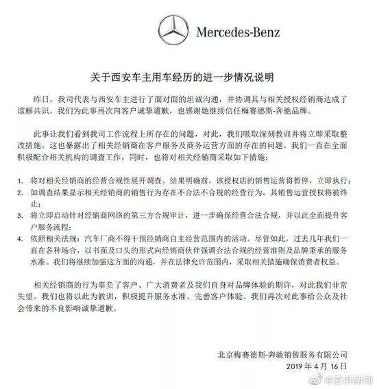 4月16日,王倩与事发地西安利之星奔驰4S店达成和解,更换了同款奔驰车、全额退款“金融服务费”,奔驰公司还主动提出带车主去德国参观工厂和流水线,并赠送车主一对一vip服务、补办生日等额外福利。