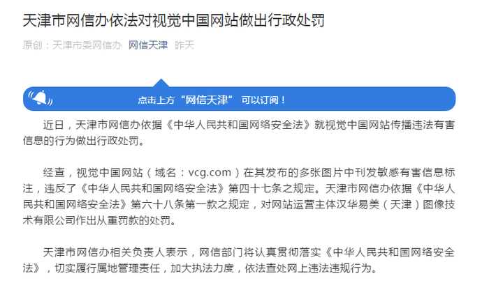 4月18日,天津市网信办对视觉中国网站传播违法有害信息的行为做出从重罚款的处罚。